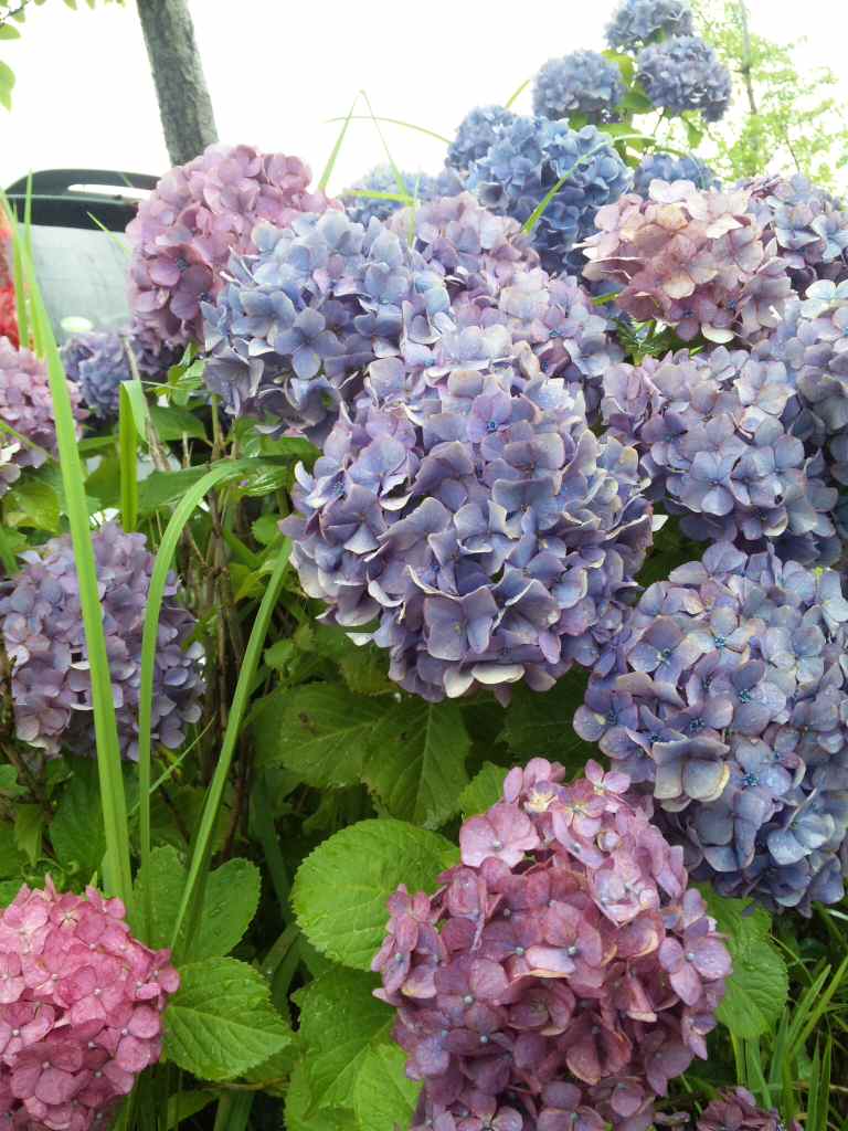 しとしとと梅雨時らしい雨が降る中、紫陽花が競って咲いています。